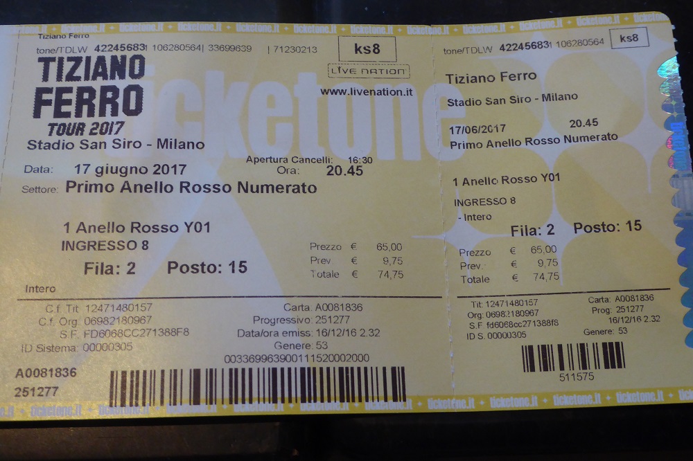 I’ve watched Tiziano’s fame skyrocket over the past decade to the point where he now seems to perform only at huge venues and for very short tours. But while visiting Italy last winter, I gleaned from what I could understand of Radio Italia’s frequent notices that he had announced a concert tour of Italy for summer of 2017. I immediately got online and found myself a ticket to one of his three shows at the San Siro Stadium in Milan, ithe very first row in the balcony above the floor of the stadium. Bravo, Matteo!