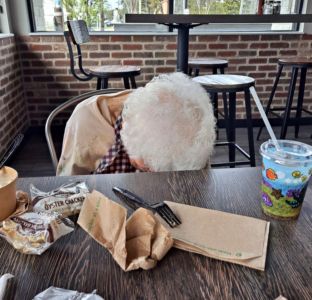 We got Norma freshened up and out the door again, met a friend of Joanne’s who lives in the area, and the four of us had dinner together at a restaurant called Alfie’s to celebrate Norma’s birthday. One of the highlights of dinner, other than the great seafood, was when Norma leaned over to me and discretely asked whether I’d noticed a woman at the next table who looked a lot like Joanne. I looked around at the tables near us and had no idea what she was talking about. No one even vaguely resembled Joanne. And then I looked to my right and realized that she thought that Joanne’s reflection in the mirrored wall beside us was another person at an adjacent table!
