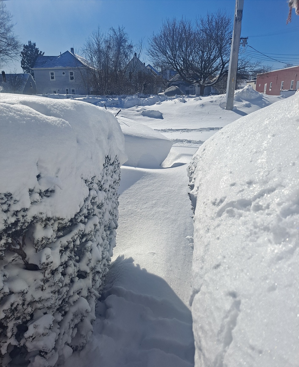 I attempted to open both my front and back doors, only to find them jammed by many inches of drifted snow. I had to push hard to get my arm out there with a broom and awkwardly brush enough snow out of the way so that I could eventually squeeze my body out onto the porch to start shoveling. I managed to clear the stairs and the path from my back door out to the sidewalk, but at the entrance to the yard, snow drifts had created a wall about four feet deep, and I gave up at that point. It dawned on me that it might be a couple of days before I’d be able to get to the sidewalk and try to excavate my car from the spot where I’d parked.